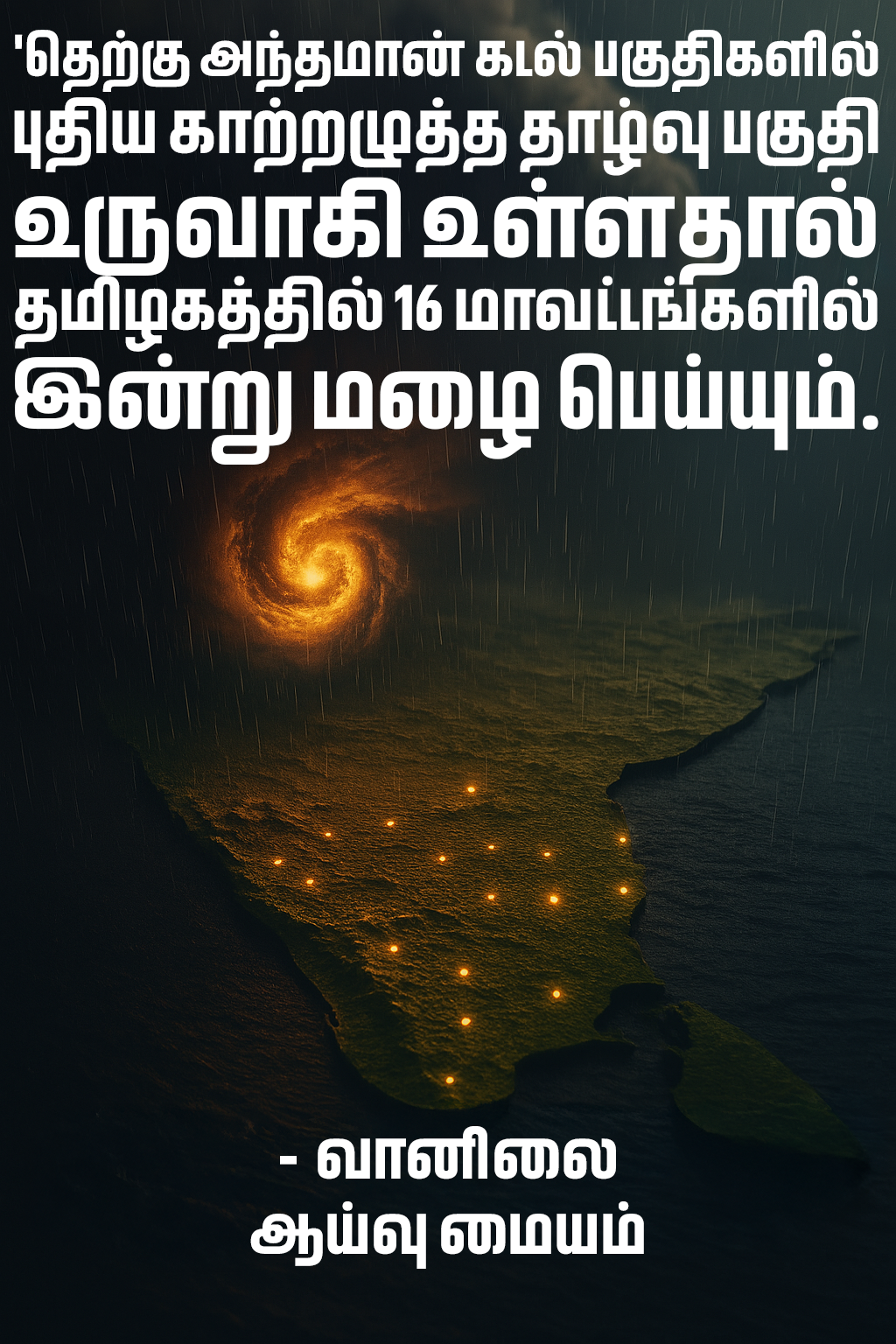 ‘தெற்கு அந்தமான் கடல் பகுதிகளில், புதிய காற்றழுத்த தாழ்வு பகுதி உருவாகி உள்ளதால், தமிழகத்தில், 16 மாவட்டங்களில், இன்று மழை பெய்யும்’ என, வானிலை ஆய்வு மையம் அறிவித்துள்ளது.
