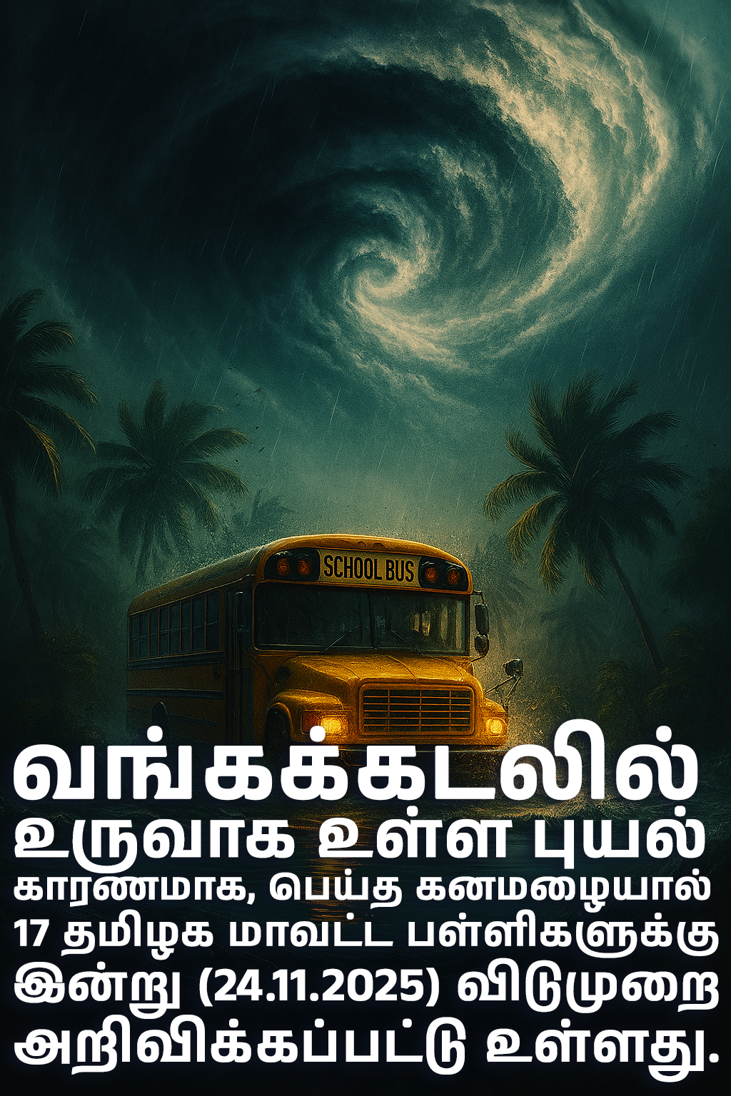 வங்கக்கடலில் உருவாக உள்ள புயல் காரணமாக, பெய்த கனமழையால் திருநெல்வேலி, தென்காசி, தூத்துக்குடி, ராமநாதபுரம், கள்ளக்குறிச்சி, திருவாரூர், புதுக்கோட்டை, திருச்சி, தஞ்சாவூர், மயிலாடுதுறை, விருதுநகர், சிவகங்கை, நாகை, கரூர், அரியலூர், மதுரை, கடலூர் ஆகிய 17 மாவட்ட பள்ளிகளுக்கு இன்று (நவ.,24) விடுமுறை அறிவிக்கப்பட்டு உள்ளது.