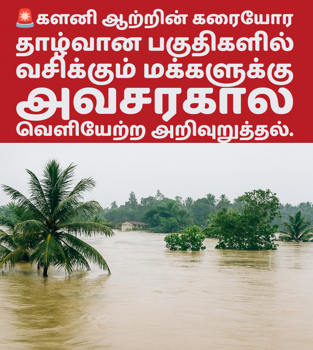 களனி பிரதேச செயலகப் பிரிவின் கீழ் உள்ள மேவெல்ல, பெத்தியாகொட, சிங்காரமுல்ல, பேலியாகொட, வெலேகொட, ஹுணுப்பிட்டி வடக்கு மற்றும் தெற்கு உள்ளிட்ட கிராம சேவகர் பிரிவுகளில் வசிக்கும் மக்களுக்கு பாதுகாப்பான இடங்களுக்கு உடனடியாக இடம்பெயருமாறு அறிவுறுத்தப்பட்டுள்ளது.