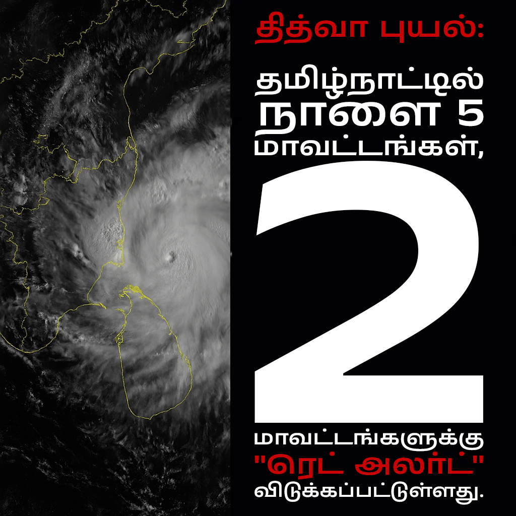 இது குறித்து சென்னை வானிலை மையம் வெளியிட்டுள்ள அறிக்கை: வங்கக்கடலில் மணிக்கு 8 கிலோ மீட்டர் வேகத்தில் தமிழக கடலோர பகுதிகளை டிட்வா புயல் நெருங்கி வருகிறது. சென்னையில் இருந்து தெற்கே 380 கிலோ மீட்டர் தொலைவில் புயல் மையம் கொண்டுள்ளது. இதன் காரணமாக, இன்று அதி கனமழை (ரெட் அலெர்ட்) பெய்ய
