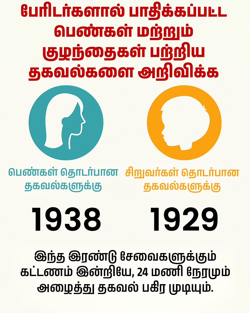 மகளிர் மற்றும் சிறுவர் அலுவல்கள் அமைச்சுடன் இணைந்துள்ள தேசிய மகளிர் சபையின் 1938 பெண்கள் உதவி அவசர தொலைபேசி இலக்கம் மற்றும் தேசிய சிறுவர் பாதுகாப்பு அதிகார சபையின் 1929 சிறுவர் உதவி அவசர தொலைபேசி இலக்கங்கள் மூன்று மொழிகளில் இலவசமாக செயல்படுகின்றன.