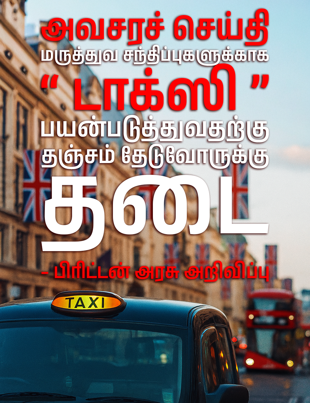 வரும் பிப்ரவரி மாதம் முதல், இங்கிலாந்தில் தஞ்சம் தேடுவோர் வழக்கமான மருத்துவ பயணங்களுக்கு டாக்ஸி பயன்படுத்த முடியாது. உடல் ஊனமுற்றோர், கர்ப்பிணிகள், அல்லது தீவிர நோயாளிகள் போன்ற விசேஷ சூழ்நிலைகளில் மட்டுமே அனுமதி வழங்கப்படும்.