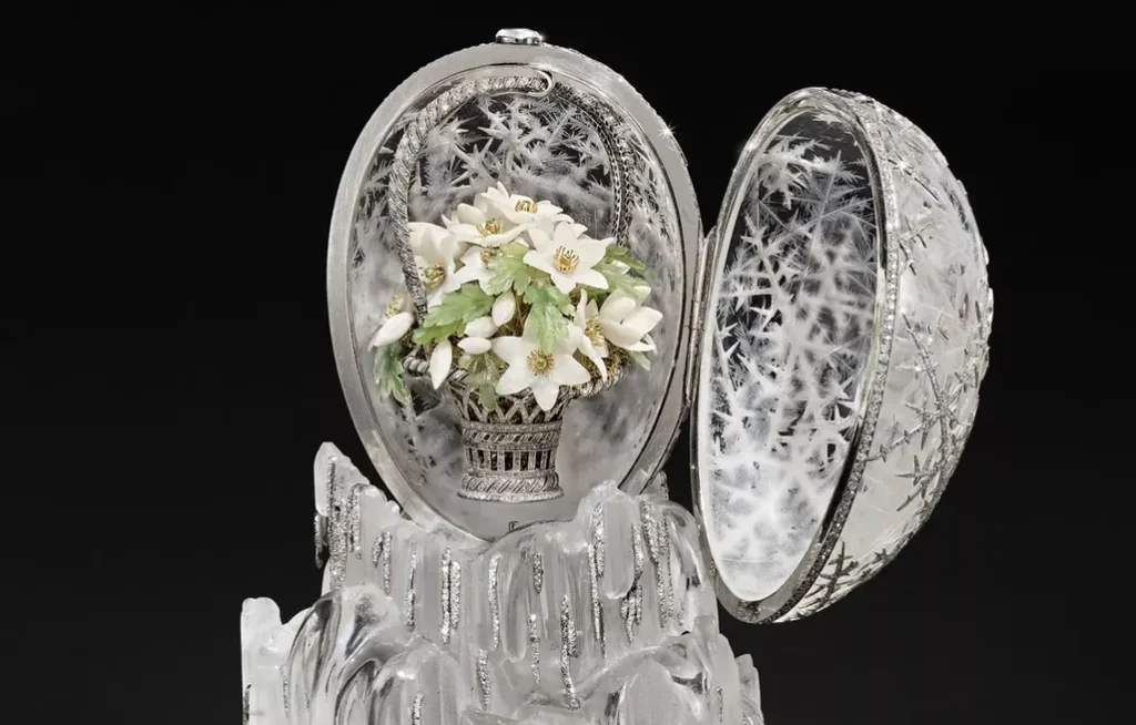 8 செ.மீ. உயரம் கொண்ட இந்த முட்டை ராக் கிரிஸ்டல் மூலம் வடிவமைக்கப்பட்டு, பிளாட்டினம் பனித்துளி வடிவங்கள் மற்றும் சுமார் 4,500 வைரங்கள் பதிக்கப்பட்டுள்ளன. ஃபாபர்ஜே பணிமனையில் பணியாற்றிய சில பெண்களில் ஒருவரான ஆல்மா தெரேசியா பிஹ்ல் இதை வடிவமைத்தார்.