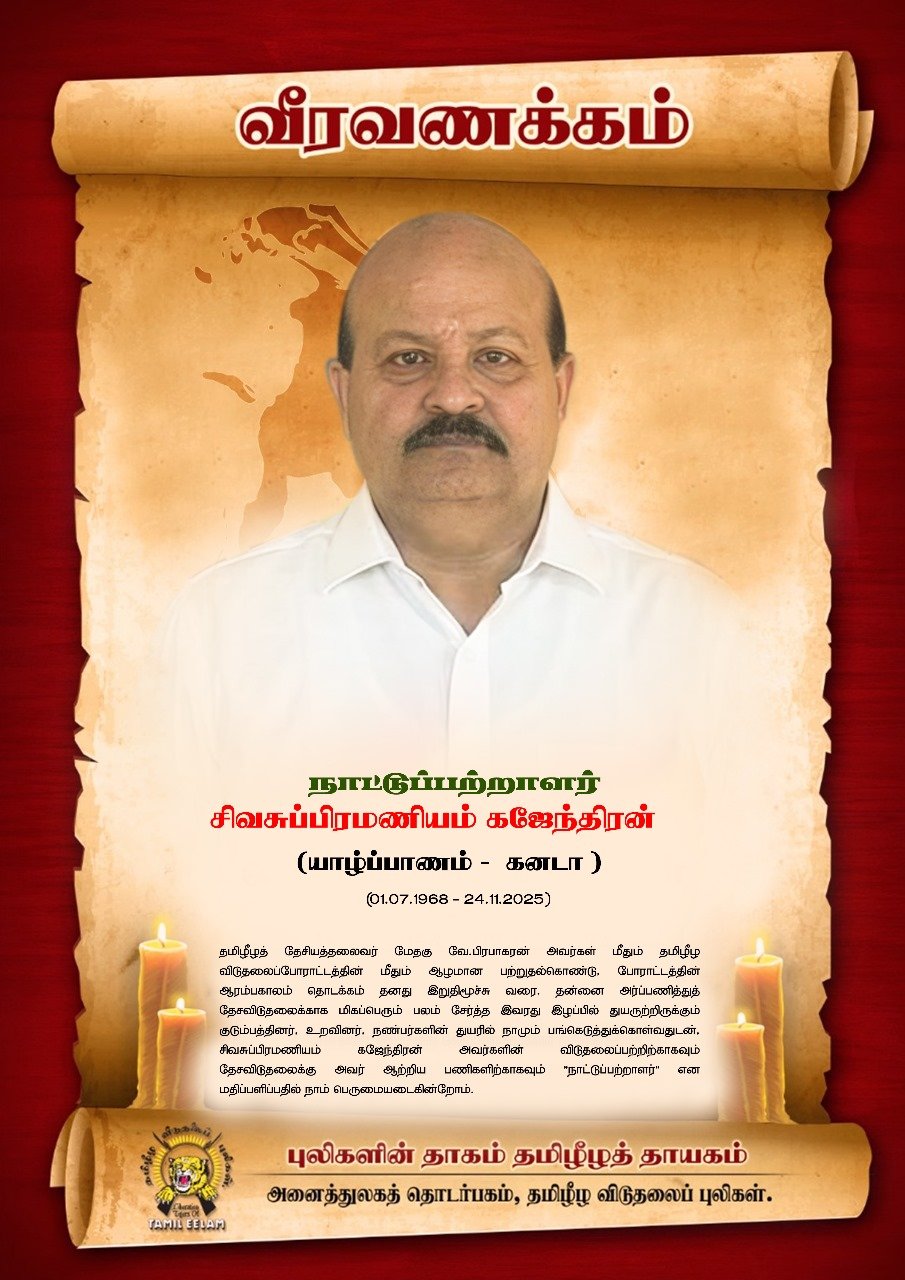 தமிழீழப்பற்றோடும் தாய்மொழிப்பற்றோடும் தனது இறுதிமூச்சுவரைத் தமிழீழ விடுதலைக்காகப் பணியாற்றிய சிவசுப்பிரமணியம் கஜேந்திரன்; அவர்கள், 24.11.2025 அன்று உடல்நலக்குறைவினால் சாவடைந்தார் என்ற செய்தி எமக்குப் பெருந்துயரினை ஏற்படுத்தியுள்ளது.