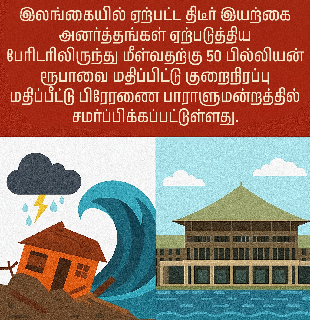 நாட்டில் ஏற்பட்ட திடீர் இயற்கை அனர்த்தங்கள் ஏற்படுத்திய பேரிடரிலிருந்து மீள்வதற்கு 50 பில்லியன் ரூபாவை மதிப்பிட்டு குறைநிரப்பு மதிப்பீட்டு பிரேரணை பாராளுமன்றத்தில் சமர்ப்பிக்கப்பட்டுள்ளது. புதன்கிழமை (03-12-2025) மாலை ஜனாதிபதி அநுரகுமார திசாநாயக்க தலைமையில் இடம்பெற்ற விசேட அமைச்சரவை கூடத்தின் போது இதற்கான அனுமதி வழங்கப்பட்டது.