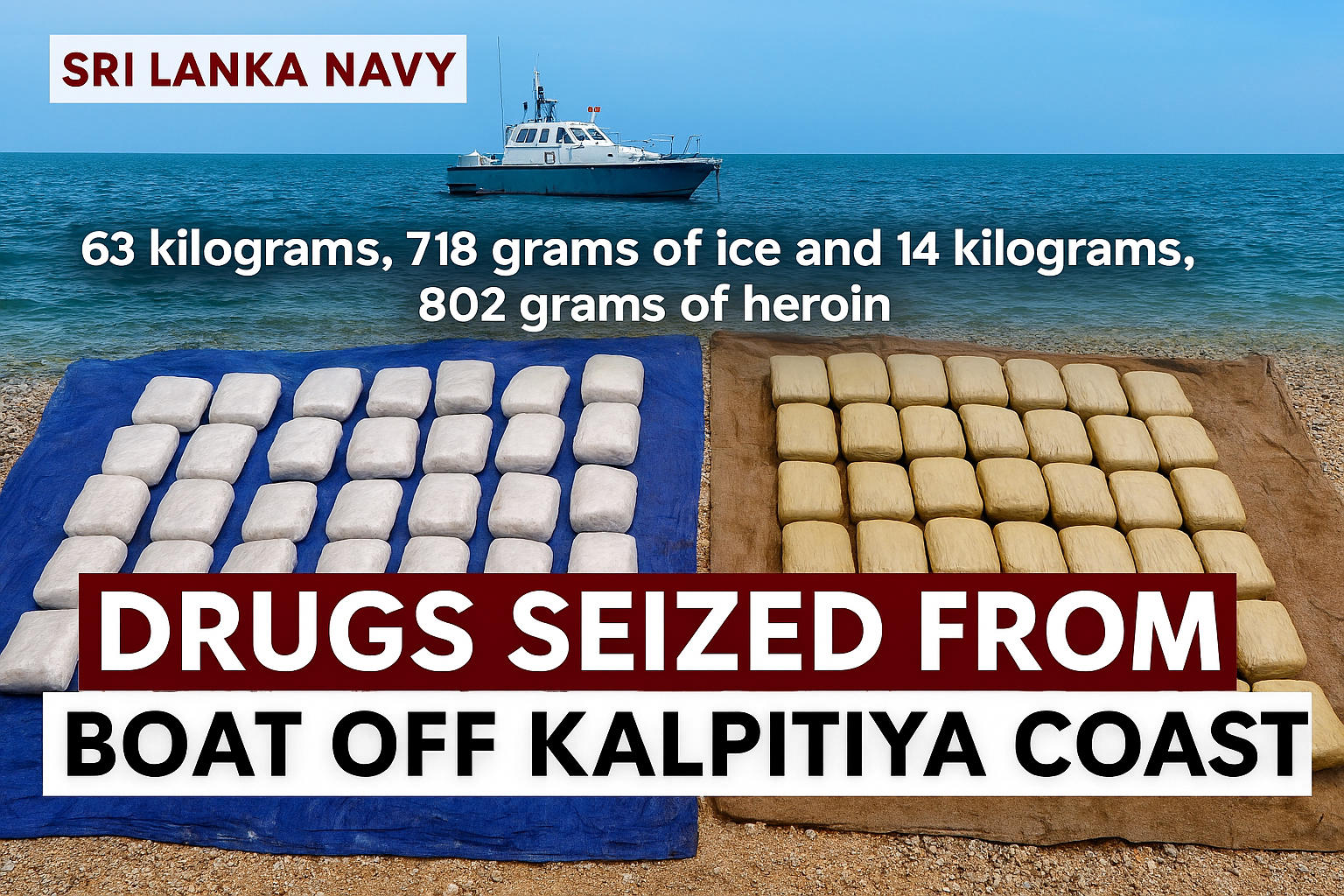 கற்பிட்டி கடற்கரையில் சந்தேகத்திற்கிடமான படகொன்றிலிருந்து 63 கிலோகிராம் 718 கிராம் ஐஸ் போதைப்பொருள் மற்றும் 14 கிலோகிராம் 802 கிராம் ஹெரோயின் போதைப்பொருள் என்பன கைப்பற்றப்பட்டுள்ளதாக இலங்கை கடற்படை தெரிவித்துள்ளது.