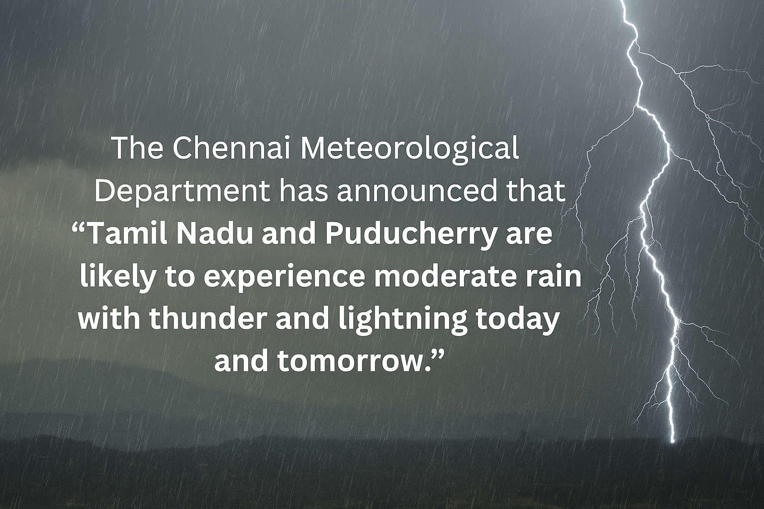 கிழக்கு திசை காற்றின் வேக மாறுபாடு காரணமாக, தமிழகத்தில் சில இடங்கள் மற்றும் புதுச்சேரியில், இன்றும், நாளையும், இடி, மின்னலுடன், மிதமான மழை பெய்ய வாய்ப்பு உள்ளது.