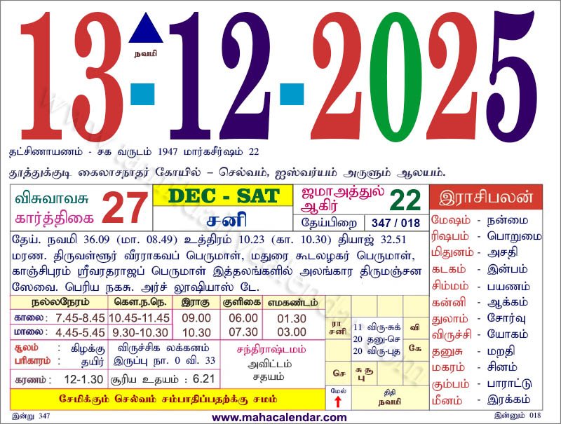| நவமி | 13-டிசம்-2025 சனிக்கிழமை 28-டிசம்பர்-2025 திங்கட்கிழமை |