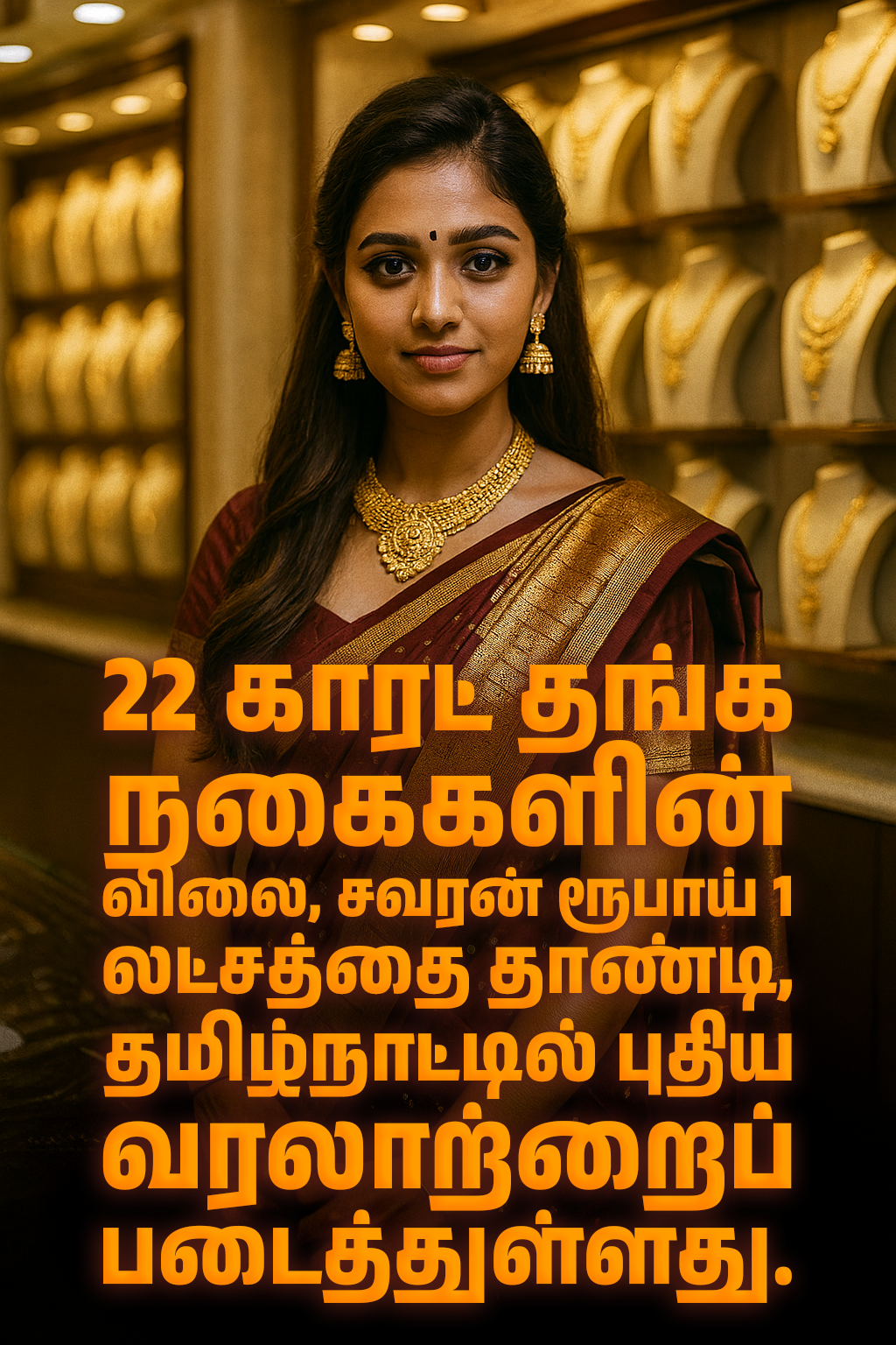 தமிழகத்தில் எப்போதும் இல்லாத வகையில் 22 காரட் ஆபரண தங்கத்தின் விலை, சவரன் ரூ.1 லட்சத்தை தாண்டி புதிய வரலாறு படைத்தது. ஒரு சவரன், 1,00,120 ரூபாய் ஆக விற்பனை ஆகிறது. இன்று ஒரே நாளில் ஒரு சவரன் தங்கம் ரூ.1,160 உயர்ந்தது.