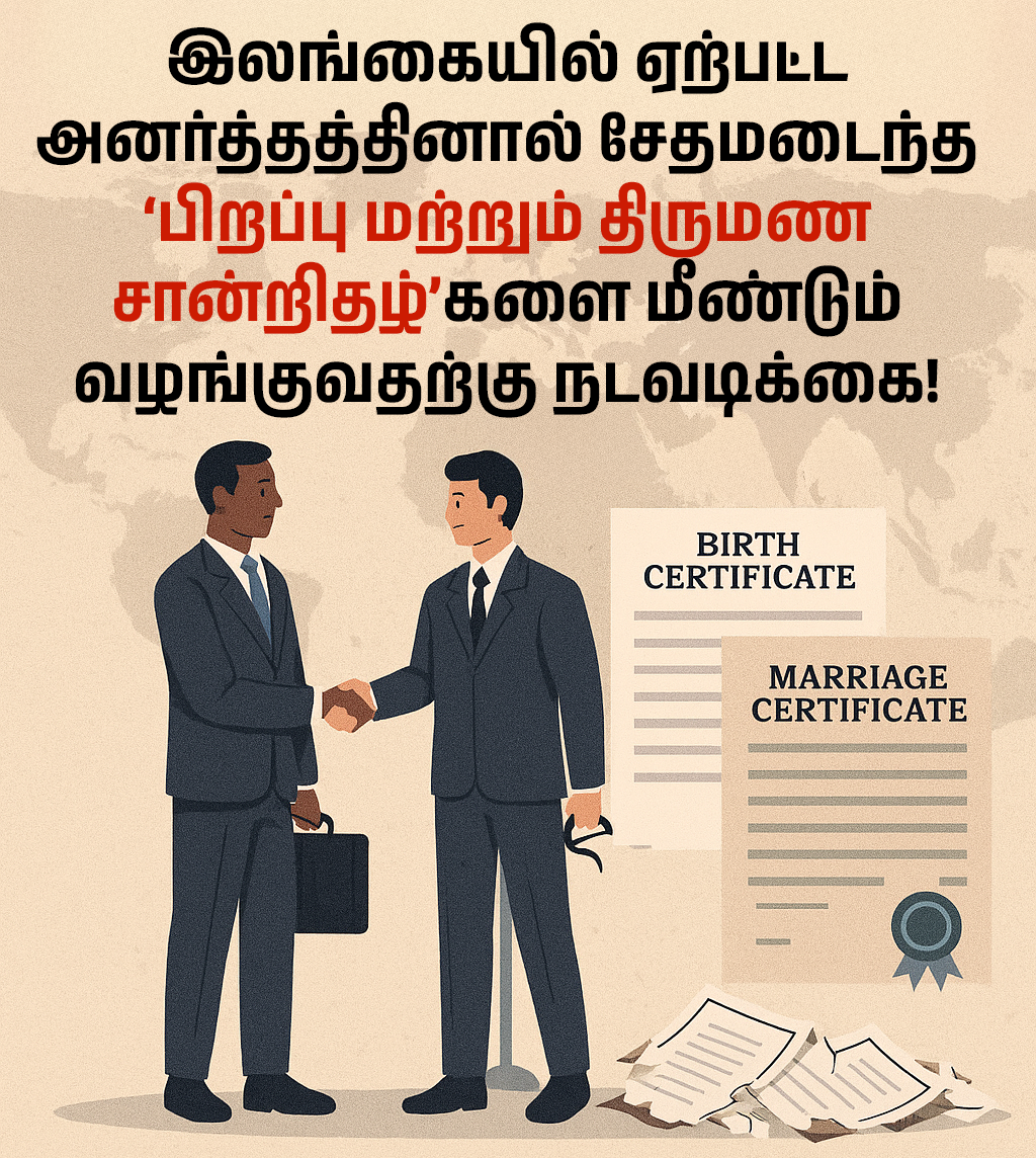 நாட்டில் ஏற்பட்ட அனர்த்தத்தினால் சேதமடைந்த பிறப்பு மற்றும் திருமண சான்றிதழ்களை மீண்டும் வழங்குவதற்கு நடவடிக்கை எடுக்கப்பட்டுள்ளதாக பதிவாளர் திணைக்களத்தின் பதிவாளர் நாயகம் சசிதேவி ஜலதீபன் தெரிவித்துள்ளார்.