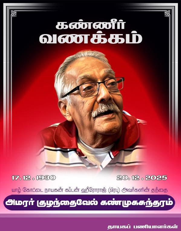புலம்பெயர் தமிழர்கள்முதன்மை செய்திகள் புகழ் வணக்கம் | சண்முகசுந்தரம் | 20.12.2025 written by 20 December 2025 0 comments 0FacebookTwitterPinterestEmail 14 அச்செழு-நீர்வேலியைச் சேர்ந்த யாழ் கோட்டையின் நாயகன், தமிழ்-சிங்கள மொழி பெயர்ப்பாளர் கப்டன் ஹீரோராஜ் அவர்களின் தந்தை சண்முகசுந்தரம் ஐயா லண்டனில் இன்றைய தினம் (20/12) காலமானார். பகிரவும் Print (Opens in new window) Print Share on WhatsApp (Opens in new window) WhatsApp Post Share on Telegram (Opens in new window) Telegram Email a link to a friend (Opens in new window) Email Share on Tumblr Share on Threads (Opens in new window) Threads Like this:Like Loading... Related Tamil Diaspora - புலம்பெயர் தமிழர்கள்UK - பிரித்தானியா 0 FacebookTwitterPinterestEmail Amizhthu previous post 𝐑𝐮𝐬𝐬𝐢𝐚’𝐬 𝐒-𝟓𝟎𝟎 “𝐏𝐫𝐨𝐦𝐞𝐭𝐡𝐞𝐮𝐬” 𝐄𝐧𝐭𝐞𝐫𝐬 𝐂𝐨𝐦𝐛𝐚𝐭 𝐃𝐮𝐭𝐲 next post 21 டிசம்பர் 2025 ஞாயிறு Leave a ReplyCancel reply