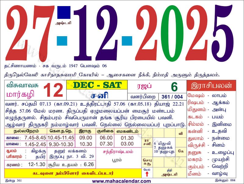 | அஷ்டமி | 12-டிசம்பர்-2025 வெள்ளிக்கிழமை 27-டிசம்பர்-2025 ஞாயிறு |