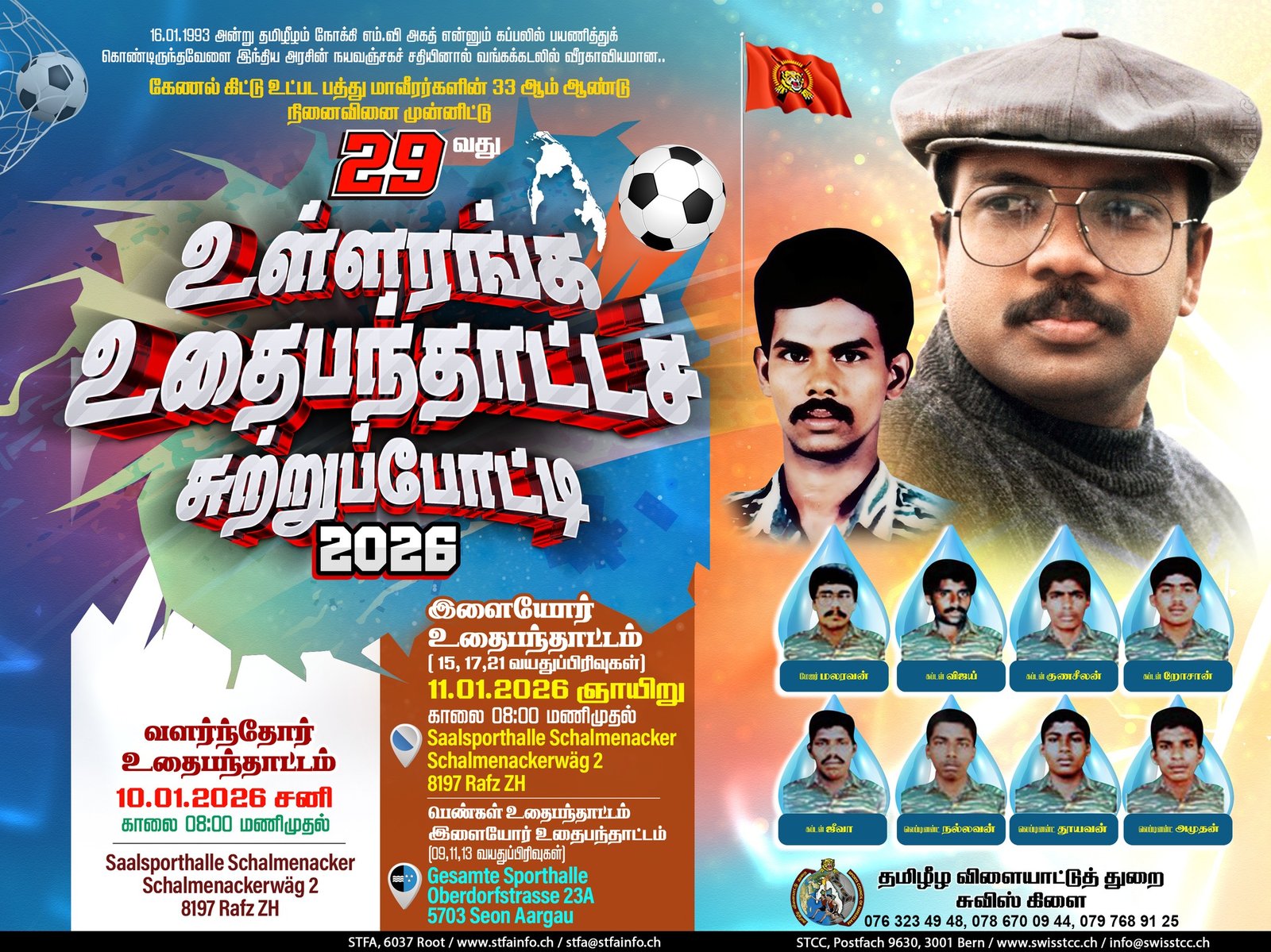புலம்பெயர் தமிழர்கள்விளையாட்டு கேணல் கிட்டு உட்பட பத்து மாவீரர்களின் நினைவுகள் சுமந்த உள்ளரங்க உதைபந்தாட்ட சுற்றுப்போட்டிகள் – சுவிஸ் written by 27 December 2025 0 comments 0FacebookTwitterPinterestEmail 14 – சுவிஸ் தமிழர் ஒருங்கிணைப்புக் குழு பகிரவும் Print (Opens in new window) Print Share on WhatsApp (Opens in new window) WhatsApp Post Share on Telegram (Opens in new window) Telegram Email a link to a friend (Opens in new window) Email Share on Tumblr Share on Threads (Opens in new window) Threads Like this:Like Loading... Related Sports News - விளையாட்டு செய்திகள்Tamil Diaspora - புலம்பெயர் தமிழர்கள்TCC-SWISS 0 FacebookTwitterPinterestEmail Amizhthu previous post புத்தாண்டும் புதுநிமிர்வும் 2026 சுவிஸ் next post அநுரகுமார திசாநாயக்கவும் கடந்த ஆட்சியாளர்களை போன்றே செயற்படுகிறார். – உதய கம்மன்பில Leave a ReplyCancel reply