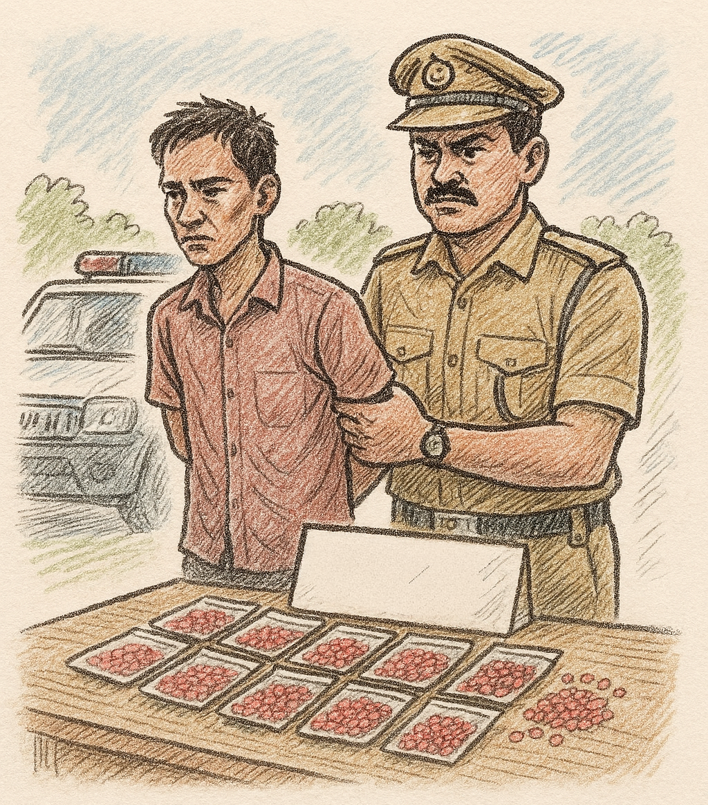 அப்போது ஒரு வீட்டில் பதுக்கி வைக்கப்பட்டிருந்த தடை செய்யப்பட்ட, 1.6 லட்சம் யாபா போதை மாத்திரைகள் பறிமுதல் செய்யப்பட்டன. இந்த போதை பொருட்களின் மதிப்பு 40 கோடி ரூபாய்.