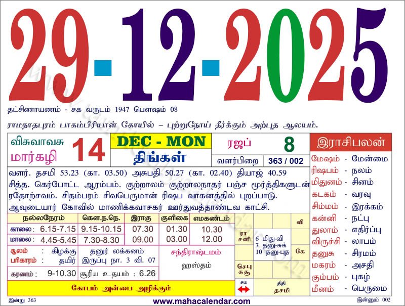 | அஷ்டமி | 12-டிசம்பர்-2025 வெள்ளிக்கிழமை 27-டிசம்பர்-2025 ஞாயிறு |