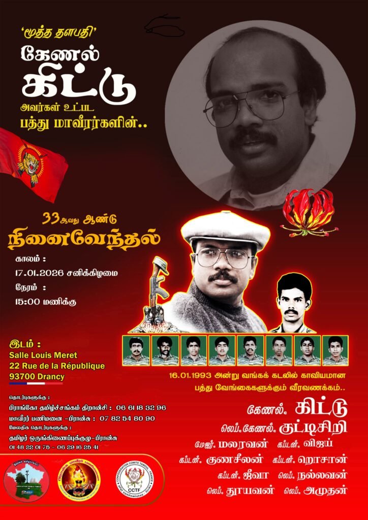 புலம்பெயர் தமிழர்கள்முதன்மை செய்திகள்கேணல் கிட்டு உட்பட 10 வீரமறவர்களின் 33 ஆம் ஆண்டு நினைவேந்தல்! பிராஞ்சு by Amizhthu 31 December 2025 written by Amizhthu 31 December 2025 0 minutes read 0 Share this: Print (Opens in new window) Print Post Share on WhatsApp (Opens in new window) WhatsApp Share on Telegram (Opens in new window) Telegram Share on Instagram (Opens in new window) Instagram Share on Tumblr Share on Threads (Opens in new window) Threads Like this:Like Loading...தொடர்புடைய செய்திகள் Tamil Diaspora - புலம்பெயர் தமிழர்கள்பிராஞ்சு 0 comments 0 FacebookTwitterPinterestEmail Amizhthu previous post அகவை வாழ்த்து – டிசம்பர் 31 next post UAE to Pull Forces from Yemen After Saudi Criticism, Deepening Rift Between Gulf Allies You may also like “நாம் ஒன்றாகச் சேர்ந்தவர்கள்” — ஐரோப்பாவுக்கு ருபியோ; ஆனால் “தங்களைத்... 14 February 2026 படிகட்டுகளின் கீழ் பதுங்கும் புதிர்: ஈரான் அணு நிலையம் அருகே... 14 February 2026 இலங்கை தலங்கம இரட்டைக் கொலை: சந்தேக நபர்களைக் கைது செய்ய... 14 February 2026 மாஞ்செஸ்டர் நீதிமன்றம்: யூத சமூகத்தை குறிவைத்து தாக்குதல் திட்டமிட்ட இருவருக்கு... 14 February 2026 காலநிலை நெருக்கடி, நீர்வளப் பாதுகாப்பு மற்றும் சோமாலிலாந்து விவகாரம்: ஆப்ரிக்க... 14 February 2026 சாட்ஜிபிடி AI கார்ட்டூன் டிரெண்ட் மோசடிக்காரர்களுக்கு புதிய ஆயுதமாக மாறலாம்... 14 February 2026 ஐரோப்பாவின் பரஸ்பர பாதுகாப்பு விதியை செயல்படுத்த வேண்டிய நேரம் வந்துவிட்டது:... 14 February 2026 இரானில் ஆட்சிமாற்றம் ‘நடக்கக்கூடிய சிறந்த விஷயம்’ என டிரம்ப் கருத்து;... 14 February 2026 சென்னையில் இன்று 22 காரட் தங்க நகைகளின் விலை சவரனுக்கு... 14 February 2026 அமெரிக்காவில் படித்து வரும் இந்திய மாணவர் ஒருவர் கடந்த நான்கு... 14 February 2026Leave a ReplyCancel reply