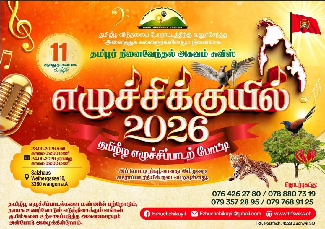 எழுச்சிக்குயில் 2026 முதன்முறையாக ஐரோப்பிய ரீதியில் நடைபெறவுள்ளது. ஐரோப்பிய நாடுகளில் வாழும் உங்கள் உறவினர்களுக்கும் அறியப்படுத்தி, ஆர்வமுள்ளவர்களைப் போட்டியில் பங்குபெற ஊக்கமளிக்குமாறு அன்புரிமையோடு கேட்டுக்கொள்கிறோம்.