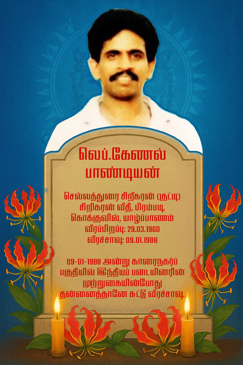 யாழ் மாவட்டம் காரைநகர் பகுதியில் 09.01.1988 அன்று இந்தியப் படையினரால் சுற்றி வளைக்கப்பட்டவேளை எதியியிடம் பிடிபடாமல் தன்னைத் தானே சுட்டு வீரச்சாவைத் தழுவிக்கொண்ட யாழ். மாவட்ட தளபதி லெப். கேணல் பாண்டியன் அவர்களின் 38’ம் ஆண்டு வீரவணக்க நாள்.