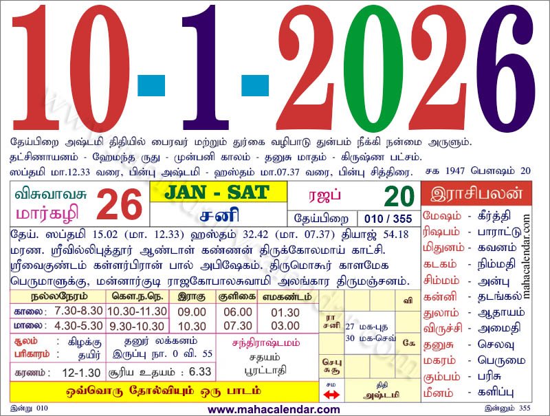 | அஷ்டமி | 11-ஜனவரி-2026 ஞாயிறு 26-ஜனவரி-2026 திங்கள் |