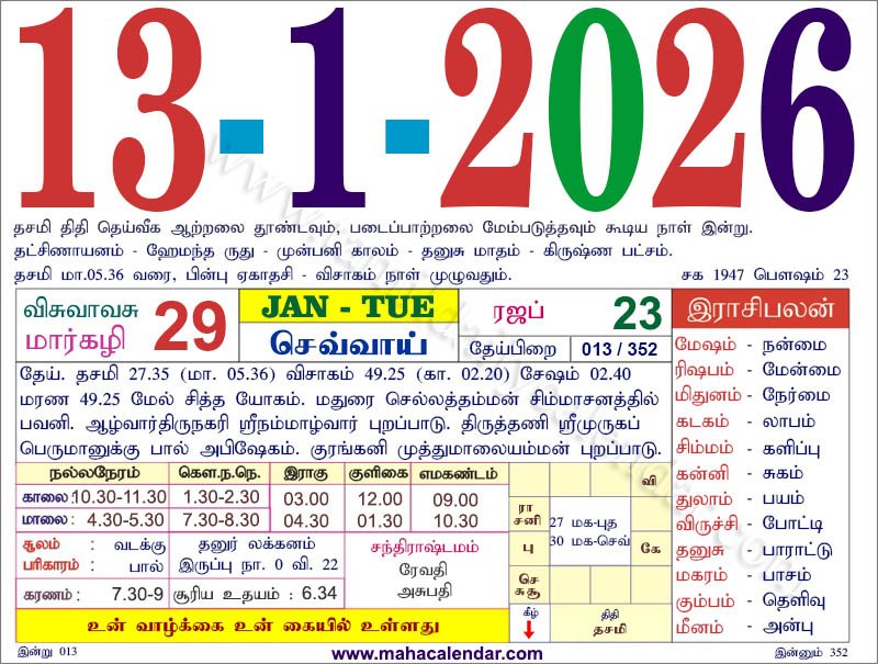 | கார்த்திகை | 27-ஜனவரி-2026 செவ்வாய் |