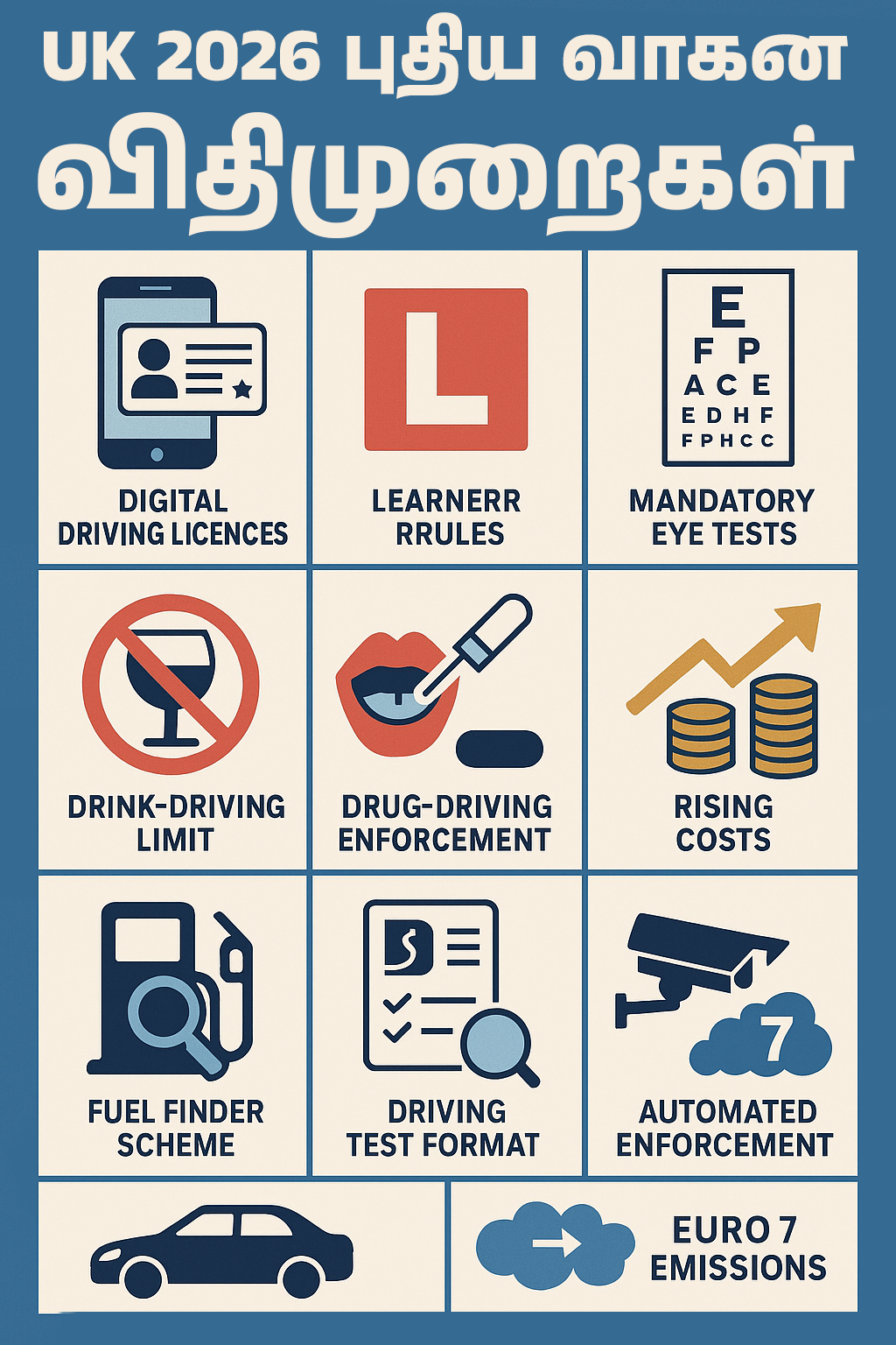 2026ஆம் ஆண்டு, UK வாகன ஓட்டுநர்களுக்கான விதிமுறைகளில் மிகப் பெரிய மாற்றங்களை கொண்டு வருகிறது. உரிமங்கள், பாதுகாப்பு, வரிகள், சட்ட அமலாக்கம் மற்றும் செலவுகள் ஆகிய அனைத்திலும் மாற்றங்கள் ஏற்படுகின்றன.