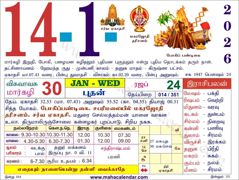| ஏகாதசி | 14-ஜனவரி-2026 புதன் 29-ஜனவரி-2026 வியாழன் |