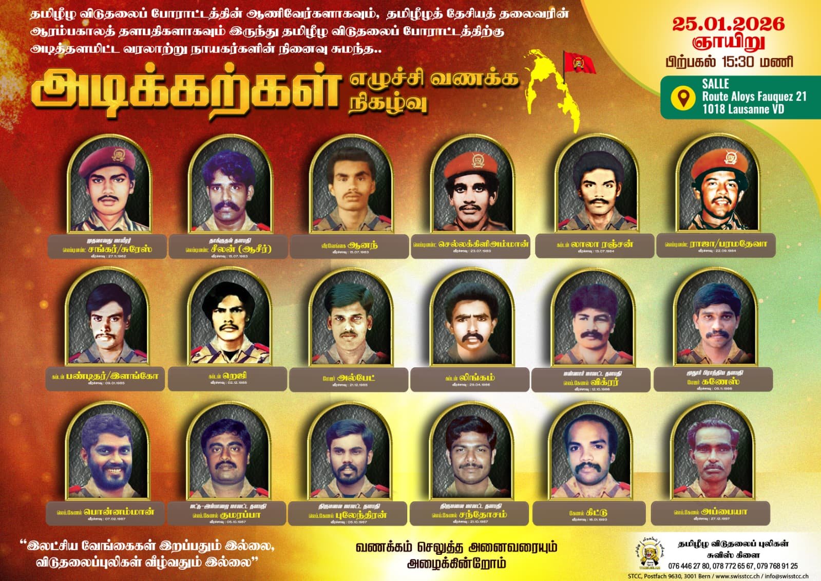அடிக்கற்கள்நிகழ்வுகள்புலம்பெயர் தமிழர்கள் அடிக்கற்கள் வணக்க நிகழ்வு 2026 – சுவிஸ் written by 23 January 2026 0 comments 0FacebookTwitterPinterestEmail 20 25/01/2026 | 15:30 மணி – 17:30 மணி Salle | Route Alloys Fauquez 21, Lausanne, 1018 பகிரவும் Print (Opens in new window) Print Share on WhatsApp (Opens in new window) WhatsApp Post Share on Telegram (Opens in new window) Telegram Email a link to a friend (Opens in new window) Email Share on Tumblr Share on Threads (Opens in new window) Threads Like this:Like Loading... Related Swiss -சுவிஸ்Tamil Diaspora - புலம்பெயர் தமிழர்கள்TCC-SWISS 0 FacebookTwitterPinterestEmail Amizhthu previous post அகவை வாழ்த்து – ஜனவரி 23 next post ஈழப்பிரியனின் “நாவுக்கரசன்” 25.01.2026 பெர்ன் Leave a ReplyCancel reply