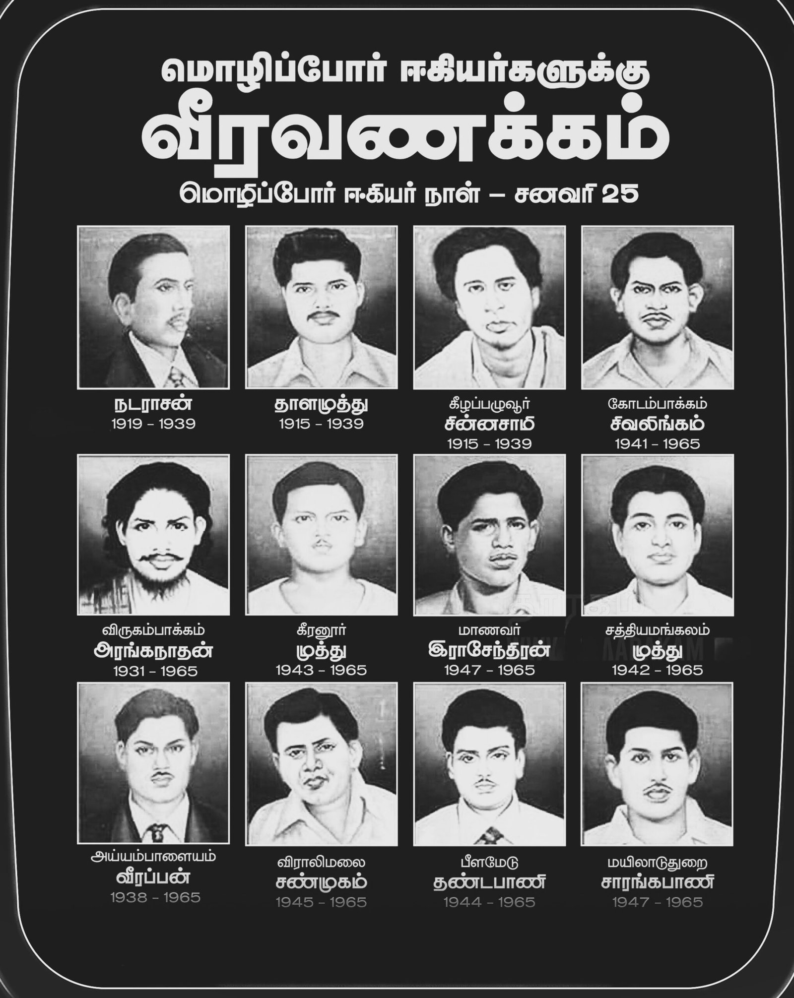 இந்த மொழிப்போரில் நடராசன் தாளமுத்து தொடங்கி எண்ணற்ற தமிழ் மறவர்கள் தங்கள் இன்னுயிரை கொடுத்து நம் தாய் மொழியாம் தமிழ் மொழியை காத்தனர். ஆனால் பகைவர்கள் இந்த தீரமிக்க மொழிப் போராட்டத்தை, வெறுமனே இந்தி எனும் ஒரு மொழிக்கு எதிரான போராட்டமாக சுருக்க நினைக்கிறார்கள். இந்த சதியை முறியடிக்க வேண்டிய பொறுப்பு தமிழர்கள் அனைவருடையது.