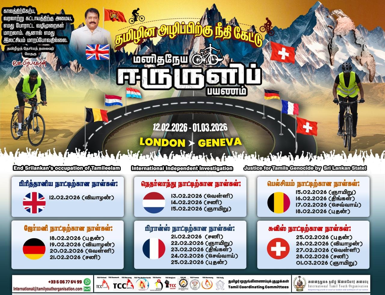 தொடங்கவுள்ள மனித உரிமைகள் ஆணையகத்தின் கூட்டத் தொடரினை முன்னிட்டு சிறிலங்கா பேரினவாத அரசினால் திட்டமிட்டு நடாத்தப்படுகின்ற தமிழின அழிப்பிற்கு அனைத்துலக சுயாதீன விசாரணைநடாத்த வேண்டியும் தமிழீழமே தமிழர்களுக்கான நிரந்தரத் தீர்வு என்பதை வலியுறுத்தியும் ஐ .நா நோக்கியஈருருளி பயணக்கவனயீர்ப்பு போராட்டம் 12.02.2026 அன்று பிரித்தானியா பிரதமர் இல்லத்திலிருந்து ஆரம்பித்து அனைத்துலகக் குற்றவியல் நீதிமன்றம் ,ஐரோப்பிய பாராளுமன்றம் ஊடாக 01.03.2026 அன்று ஜெனிவா ஐக்கிய நாடுகள் அவை முன்றலை வந்தடைவுள்ளது