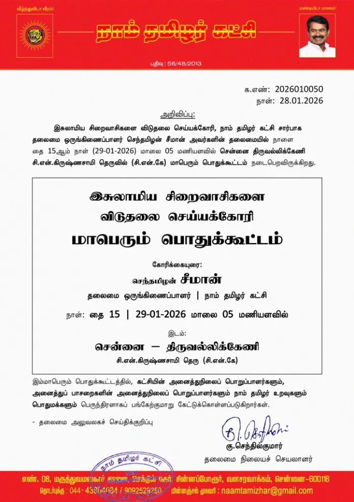 இசுலாமிய சிறைவாசிகளை விடுதலை செய்யக்கோரி, நாம் தமிழர் கட்சி சார்பாக தலைமை ஒருங்கிணைப்பாளர் செந்தமிழன் சீமான் அவர்களின் தலைமையில் நாளை தை 15ஆம் நாள் (29-01-2026) மாலை 05 மணியளவில் சென்னை திருவல்லிக்கேணி சி.என்.கிருஷ்ணசாமி தெருவில் (சி.என்.கே) மாபெரும் பொதுக்கூட்டம் நடைபெறவிருக்கிறது.