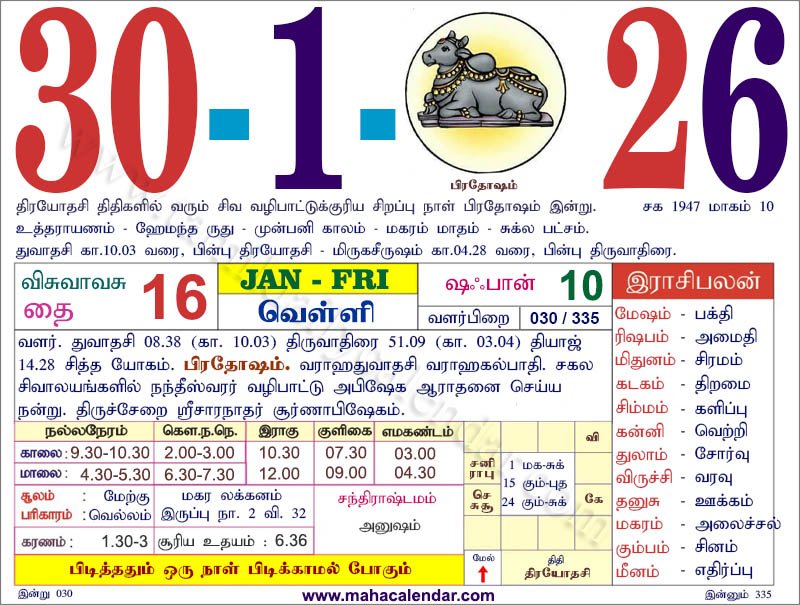 | கார்த்திகை | 27-ஜனவரி-2026 செவ்வாய் |