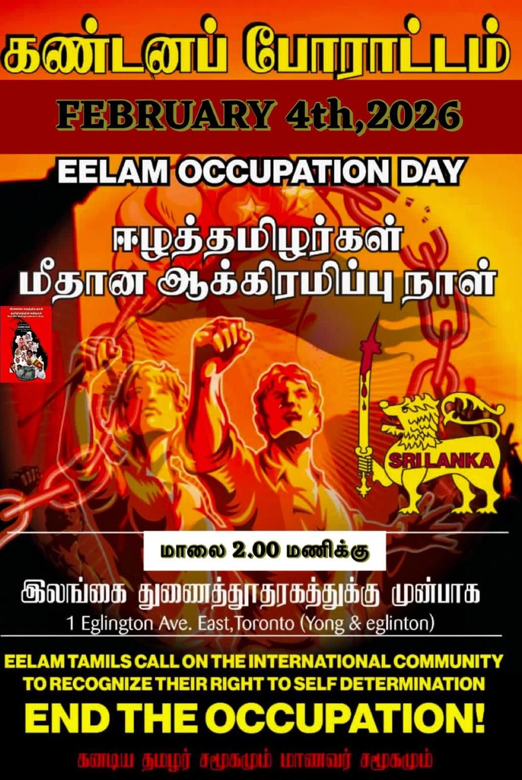 ஆகவே சிங்கள சுதந்திரநாள் தமிழர்களின் கரி நாள் என்பதை முன்வைத்து பிப்ரவரி 4-ஆம் தேதி, டொராண்டோவில் உள்ள 1 Eglinton Ave. East (Yonge & Eglinton) பகுதியில், மாலை 2.00 மணிக்கு கண்டனப் போராட்டம் நடைபெற உள்ளது.
