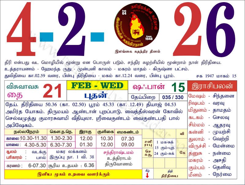 | சதுர்த்தி | 21-பிப்ரவரி-2026 சனிக்கிழமை |