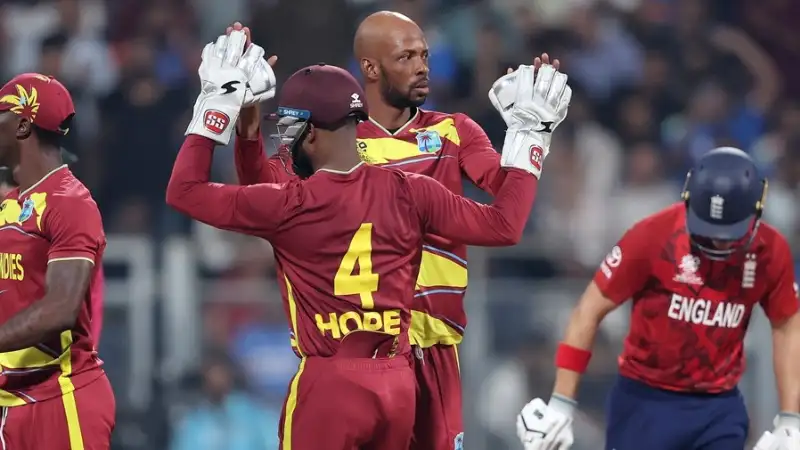 மும்பை, வான்கடே மைதானத்தில் நடந்த ‘டி-20’ உலக கோப்பை தொடருக்கான ‘சி’ பிரிவு லீக் போட்டியில் வெஸ்ட் இண்டீஸ், இங்கிலாந்து அணிகள் மோதின. ‘டாஸ்’ வென்ற இங்கிலாந்து கேப்டன் ஹாரி புரூக், ‘பீல்டிங்’ தேர்வு செய்தார்.