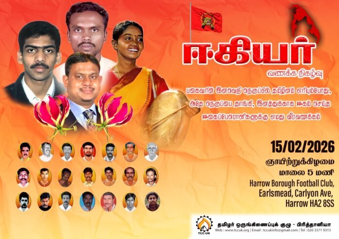 நிகழ்வுகள்புலம்பெயர் தமிழர்கள்முதன்மை செய்திகள் ஈகியர் வணக்க நிகழ்வு 2026 இங்கிலாந்து written by 13 February 2026 0 comments 0FacebookTwitterPinterestEmail 30 ஈகியர் வணக்க நிகழ்வு 2026 இங்கிலாந்து பகிரவும் Print (Opens in new window) Print Share on WhatsApp (Opens in new window) WhatsApp Post Share on Telegram (Opens in new window) Telegram Email a link to a friend (Opens in new window) Email Share on Tumblr Share on Threads (Opens in new window) Threads Like this:Like Loading... Related Tamil Diaspora - புலம்பெயர் தமிழர்கள்UK - பிரித்தானியா 0 FacebookTwitterPinterestEmail Amizhthu previous post “மிகவும் கொடிய செயல்”: நர்சரி குழந்தைகளை துஷ்பிரயோகம் செய்த வின்சென்ட் சான் – 18 ஆண்டுகள் சிறைத் தண்டனை next post தமிழின அழிப்பிற்கு நீதி கேட்டு மனித நேய ஈருருளிப் பயணம் Leave a ReplyCancel reply