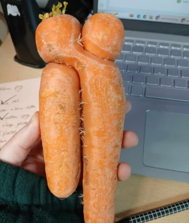 Food Works Sheffield என்ற சமூக நிறுவனத்தில் தன்னார்வலர்கள் வழக்கமான வகைத் தேர்வு பணியில் இருந்தபோது, இந்த விசித்திரமான கேரட் ஜோடியை கண்டனர். சாதாரண காய்கறிகளின் நடுவே ஒன்றை ஒன்று அணைத்தபடி இருந்த இந்த கேரட்டுகள், உடனே அனைவரின் கவனத்தையும் ஈர்த்தன. அவற்றை வெட்டி உணவாக மாற்றாமல், மையத்தின் கவுண்டரின் அருகே காட்சிப்படுத்த முடிவு செய்யப்பட்டது.