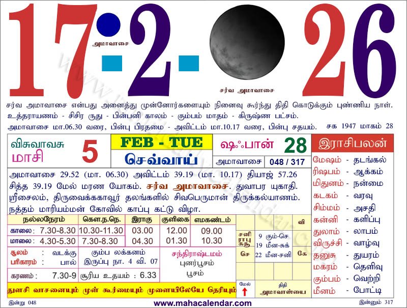 | அமாவாசை | 17-பிப்ரவரி-2026 செவ்வாய் |