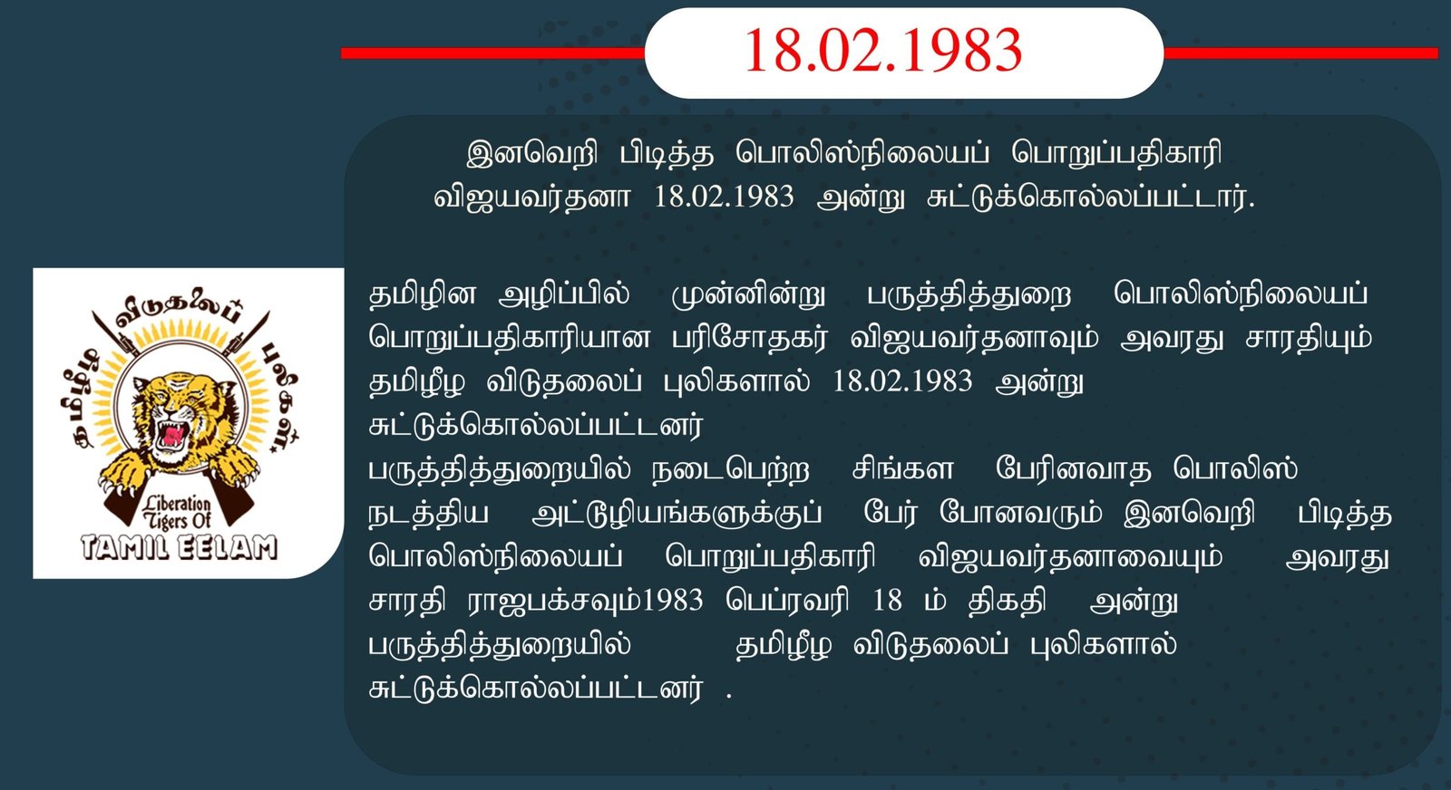பருத்தித்துறையில் நடைபெற்ற சிங்கள பேரினவாத பொலிஸ் நடத்திய அட்டூழியங்களுக்குப் பேர் போனவரும் இனவெறி பிடித்த பொலிஸ்நிலையப் பொறுப்பதிகாரி விஜயவர்தனாவையும் அவரது சாரதி ராஜபக்சவும்1983 பெப்ரவரி 18 ம் திகதி அன்று பருத்தித்துறையில் தமிழீழ விடுதலைப் புலிகளால் சுட்டுக் கொல்லப்பட்டனர்.