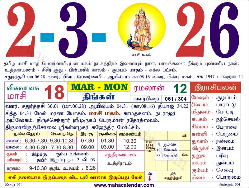 | கார்த்திகை | 23-மார்ச்-2026 திங்கட்கிழமை |