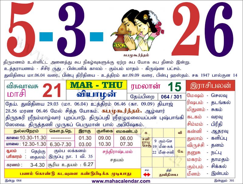 | திருமண நாட்கள் | 05-மார்ச்-2026 வியாழன் தேய்பிறை 06-மார்ச்-2026 வெள்ளிக்கிழமை தேய்பிறை 08-மார்ச்-2026 ஞாயிறு தேய்பிறை 15-மார்ச்-2026 ஞாயிறு தேய்பிறை தேய்பிறை 16-மார்ச்-2026 திங்கட்கிழமை தேய்பிறை தேய்பிறை 25-மார்ச்-2026 புதன்கிழமை வளர்பிறை |