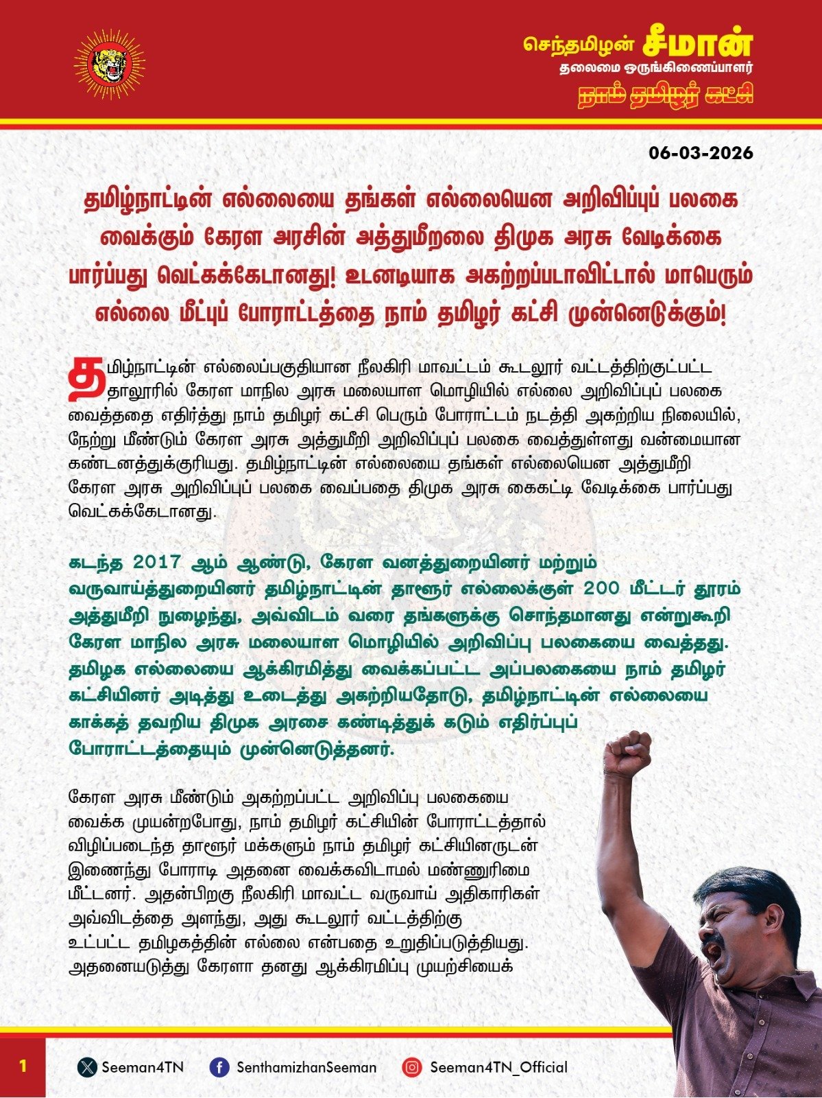 தமிழ்நாட்டின் எல்லைப்பகுதியான நீலகிரி மாவட்டம் கூடலூர் வட்டத்திற்குட்பட்ட தாலூரில் கேரள மாநில அரசு மலையாள மொழியில் எல்லை அறிவிப்புப் பலகை வைத்ததை எதிர்த்து நாம் தமிழர் கட்சி பெரும் போராட்டம் நடத்தி அகற்றிய நிலையில், நேற்று மீண்டும் கேரள அரசு அத்துமீறி அறிவிப்புப் பலகை வைத்துள்ளது வன்மையான கண்டனத்துக்குரியது. தமிழ்நாட்டின் எல்லையை தங்கள் எல்லையென அத்துமீறி கேரள அரசு அறிவிப்புப் பலகை வைப்பதை திமுக அரசு கைகட்டி வேடிக்கை பார்ப்பது வெட்கக்கேடானது.