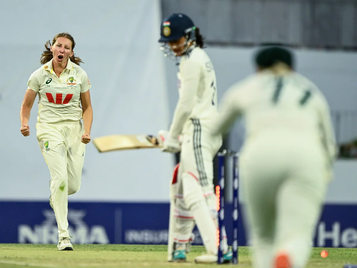 பின் முதல் இன்னிங்சை துவக்கிய ஆஸ்திரேலிய அணிக்கு ஜார்ஜியா (2), லிட்ச்பீல்டு (9), கேப்டன் அலிசா ஹீலி (13) ஏமாற்றினர். ஆட்டநேர முடிவில் ஆஸ்திரேலிய அணி முதல் இன்னிங்சில் 96/3 ரன் எடுத்திருந்தது. எல்லிஸ் பெர்ரி (43), அனாபெல் (20) அவுட்டாகாமல் இருந்தனர். இந்தியா சார்பில் சயாலி 2, கிராந்தி ஒரு விக்கெட் வீழ்த்தினர்.