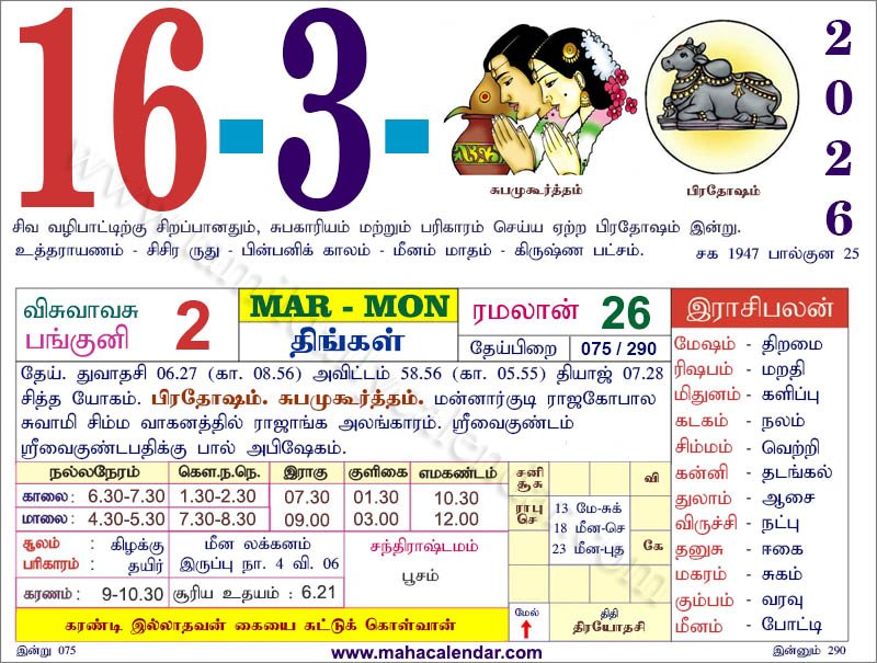 | கார்த்திகை | 23-மார்ச்-2026 திங்கட்கிழமை |