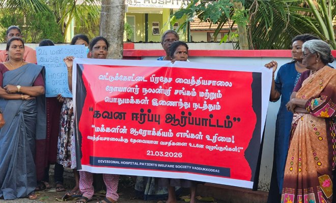 யாழ்ப்பாணம் – வட்டுக்கோட்டை பிரதேச வைத்தியசாலைக்கு முன்பாக, பல்வேறு கோரிக்கைகளை முன்வைத்து மக்கள் நேற்றைய தினம் (21-03-2026) அமைதியான முறையில் கவனீர்ப்பு போராட்டத்தில் ஈடுபட்டனர்.