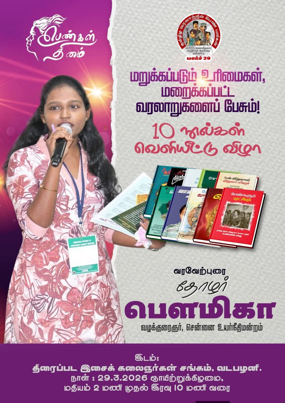 அனைத்துலகப் பெண்கள் தினத்தை முன்னிட்டு மார்ச் 29 மறுக்கப்படும் உரிமைகள், மறைக்கப்பட்ட வரலாறுகளைப் பேசும்! 10 நூல்கள் வெளியீட்டு விழா
