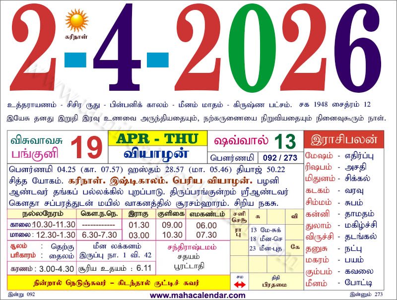 | திருமண நாட்கள் | 06-ஏப்-2026 திங்கட்கிழமை தேய்பிறை 12-ஏப்-2026 ஞாயிறு தேய்பிறை 13-ஏப்-2026 திங்கட்கிழமை தேய்பிறை 16-ஏப்-2026 வியாழன் தேய்பிறை 20-ஏப்-2026 திங்கட்கிழமை வளர்பிறை 23-ஏப்-2026 வியாழன் வளர்பிறை 30-ஏப்-2026 வியாழன் வளர்பிறை |