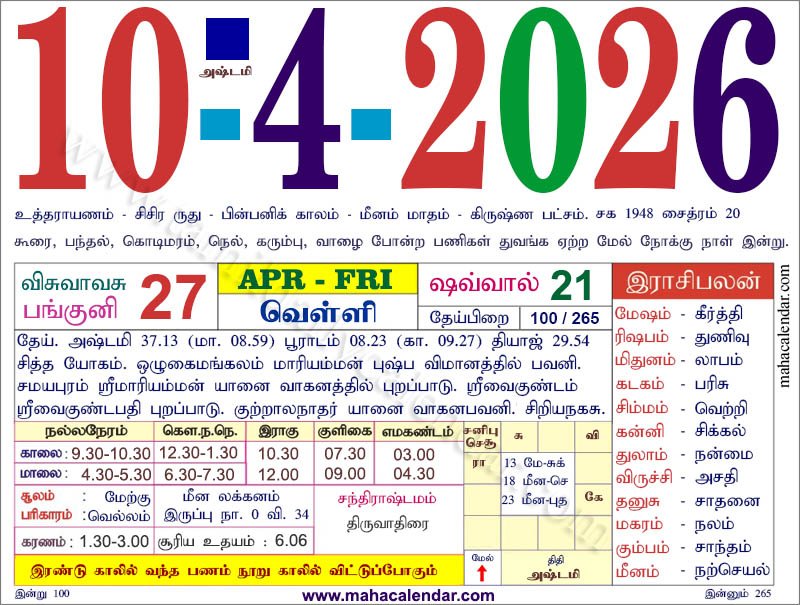 | அஷ்டமி | 10-ஏப்-2026 வெள்ளிக்கிழமை 24-ஏப்-2026 வெள்ளிக்கிழமை |