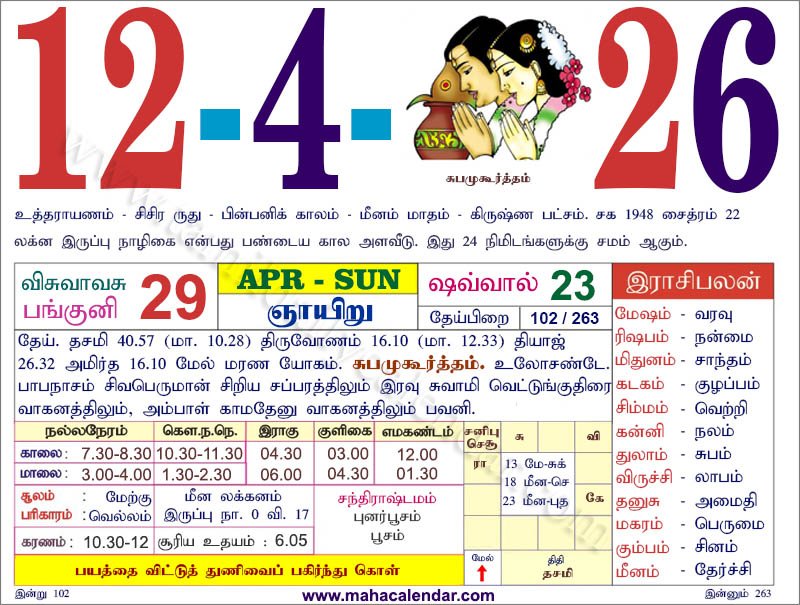 | திருமண நாட்கள் | 06-ஏப்-2026 திங்கட்கிழமை தேய்பிறை 12-ஏப்-2026 ஞாயிறு தேய்பிறை 13-ஏப்-2026 திங்கட்கிழமை தேய்பிறை 16-ஏப்-2026 வியாழன் தேய்பிறை 20-ஏப்-2026 திங்கட்கிழமை வளர்பிறை 23-ஏப்-2026 வியாழன் வளர்பிறை 30-ஏப்-2026 வியாழன் வளர்பிறை |