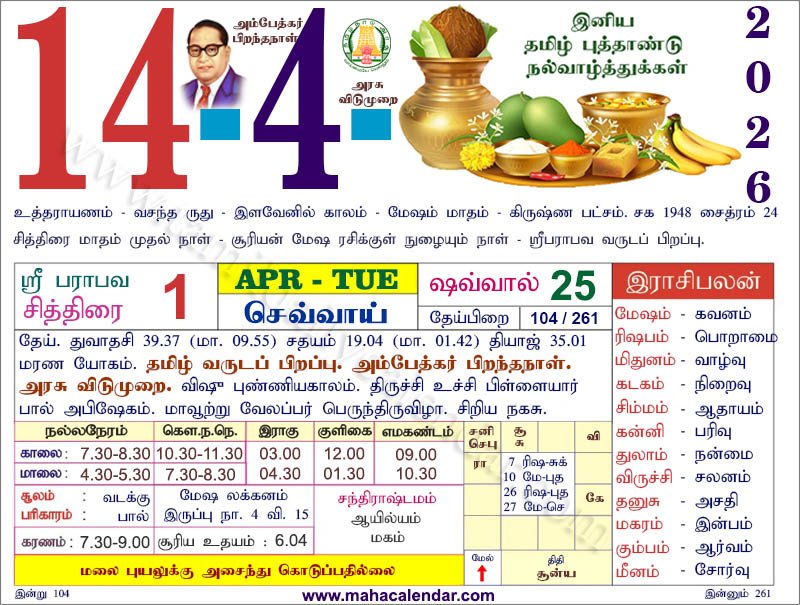 | சதுர்த்தி | 20-ஏப்-2026 திங்கட்கிழமை |