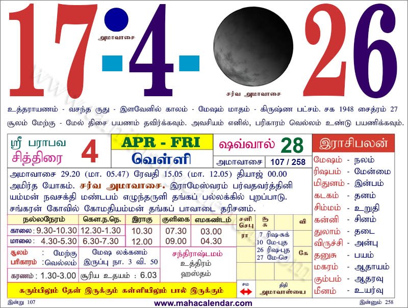 | அமாவாசை | 17-ஏப்-2026 வெள்ளிக்கிழமை |